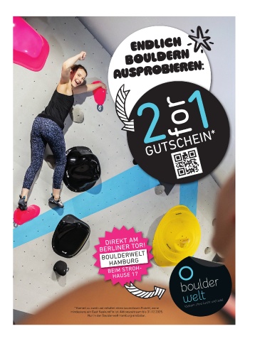 GUTSCHEIN* DIREKT AM BERLINER TOR! BOULDERWELT HAMBURG BEIM STROH- HAUSE 17 * Kommt zu zweit und erhaltet einen kostenlosen Eintritt, wenn mindestens ein Gast Neukund*in ist. Aktionszeitraum bis 31.12.2025. Nur in der Boulderwelt Hamburg einlösbar.